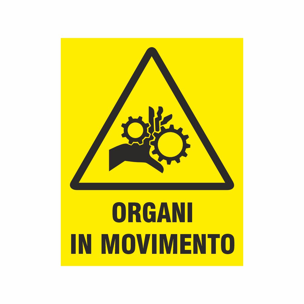 Adesivo in pvc con fondo giallo da apporre sopra le attrezzature dove sussiste il rischio di schiacciamento delle mani da organi in movimento al fine di evitare incidenti o infortuni. Simbolo e scritta Pericolo organi in movimento.