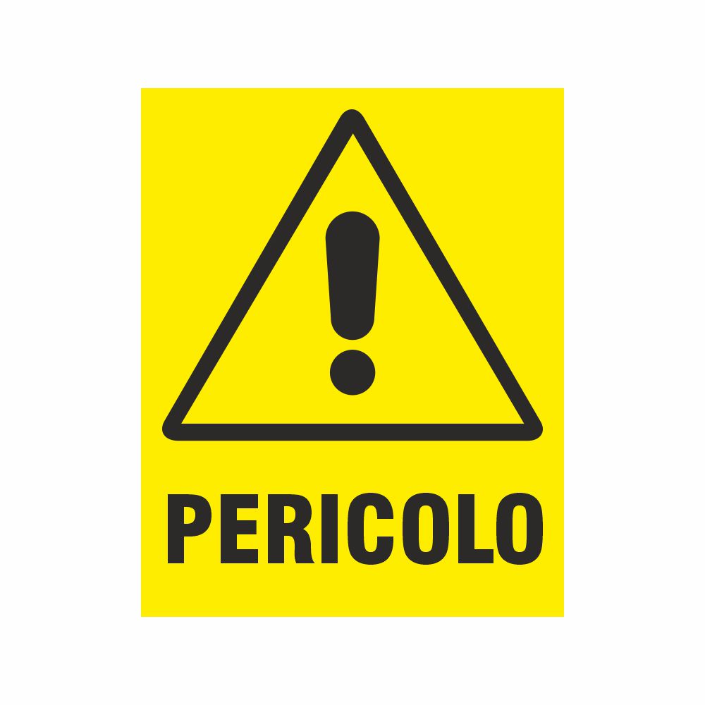 Adesivo in pvc con fondo giallo da apporre sopra le attrezzature dove sussiste un pericolo che può causare incidenti o infortuni. Simbolo e scritta Pericolo. Il cartello va integrato con l'informazione specifica di pericolo.