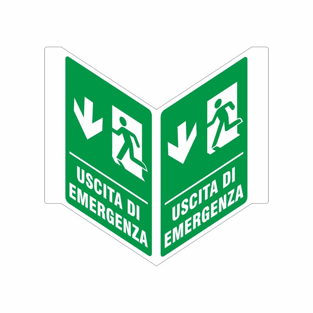 Cartello uscita di emergenza bifacciale UNI EN ISO 7010 lato opposto attacco Cartello in alluminio preverniciato bianco spessore 0,5 mm Pittogramma e scritta uscita di emergenza Pittogrammi corrispondenti UNI EN ISO 7010: Safe condition sign E001 and auxillary E003, Emergency exit direction left; Safe condition sign E002 and auxillary E003, Emergency exit direction right Stampa durevole e resistente. Angoli arrotondati. Imballo in nylon Dimensione 230x310 (X2)+40 mm; Formato aperto 540x310 mm. Aletta da 40 mm con fori e angoli. Dimensioni totali del cartello piegato 390x310x190 mm. Distanza di visibilità 9 metri Conforme D.Lgs. 81-08, UNI 7543 e UNI EN ISO 7010. Utilizzo: il cartello è bifacciale per applicazione a bandiera su parete che lo rende visibile da entrambi i lati ma non frontalmente. Può essere applicato in corridoi, intersezioni e tutti quei luoghi dove è necessario sia visibile in modo bilaterale. Questo cartello indica il percorso di esodo da seguire in caso di emergenza. In questo caso l'uscita di emergenza o il percorso di emergenza sono direzionati verso il lato di attacco del cartello (se il cartello è aderito sulla sinistra, il percorso verrà indicato sulla sinistra, se è aderito sulla destra il percorso verrà indicato verso destra). Per identificare chiaramente il percorso di esodo si applicano più cartelli lungo il tragitto ad una distanza calcolata in base alla visibilità del pittogramma. Metodi di adesione consigliati: collante siliconico su muro o su superficie liscia e piana; la soluzione più stabile e sicura tuttavia risulta con viti e tasselli utilizzando i fori diametro 3 mm predisposti agli angoli delle alette. Nota: la struttura ad ala di gabbiano del segnale è rigida e permette una maggiore stabilità rispetto le soluzioni "a linea". La struttura consensente di modificare in modo leggero la piegatura, stringendo o allargando l'apertura in modo manuale, al fine di addattare il segnale alla superficie di adesione. Il sistema è sconsigliato se si ha la necessità di un cartello bifacciale piegato chiuso ("a linea").